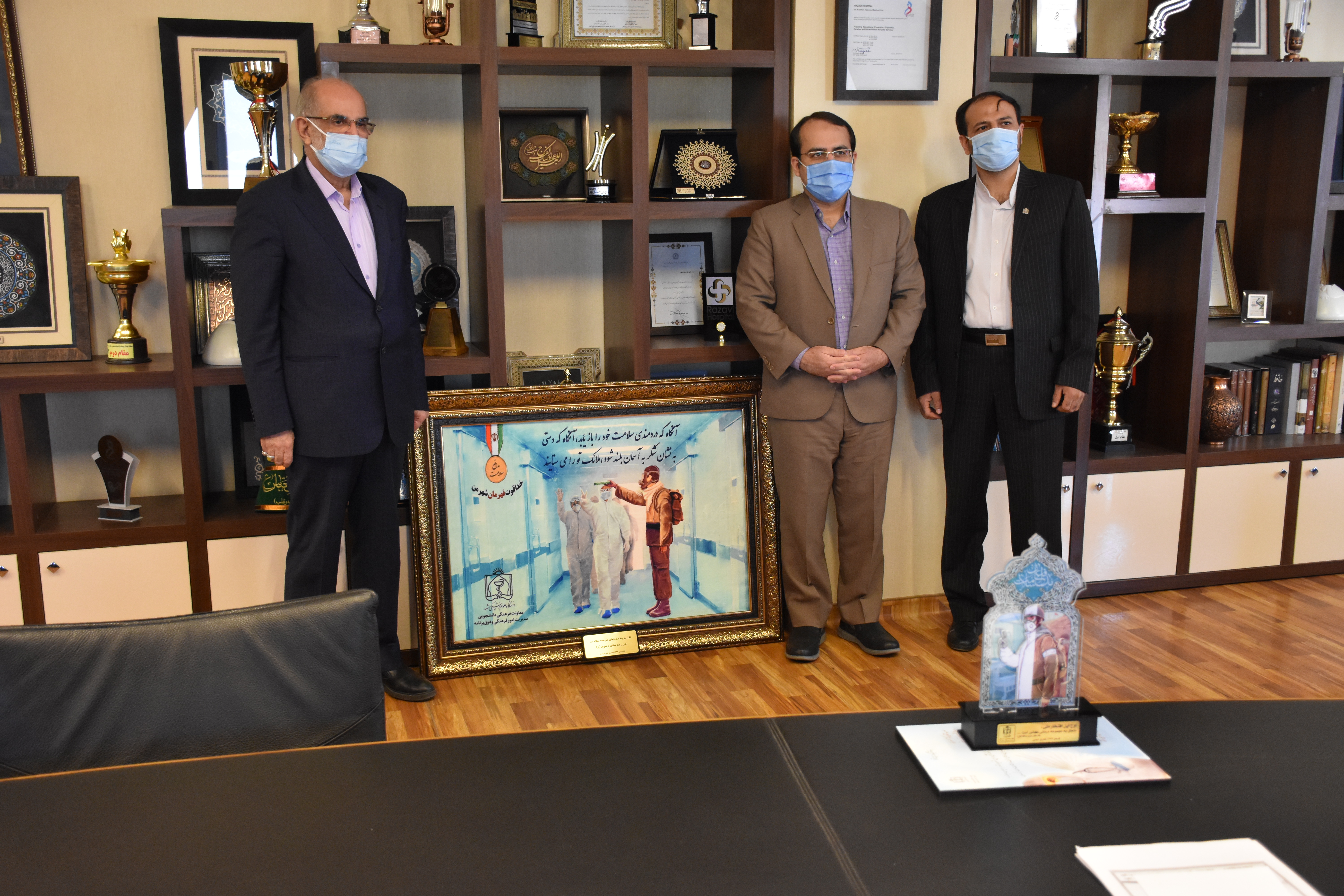 گفتنی است در پایان تابلو فرش مزین به تصویر مدافعان سلامت به جهت قدردانی از زحمات بی وقفه و خستگی ناپذیر دکتر محور و همکاران خدوم بیمارستان رضوی به ایشان اهدا شد.