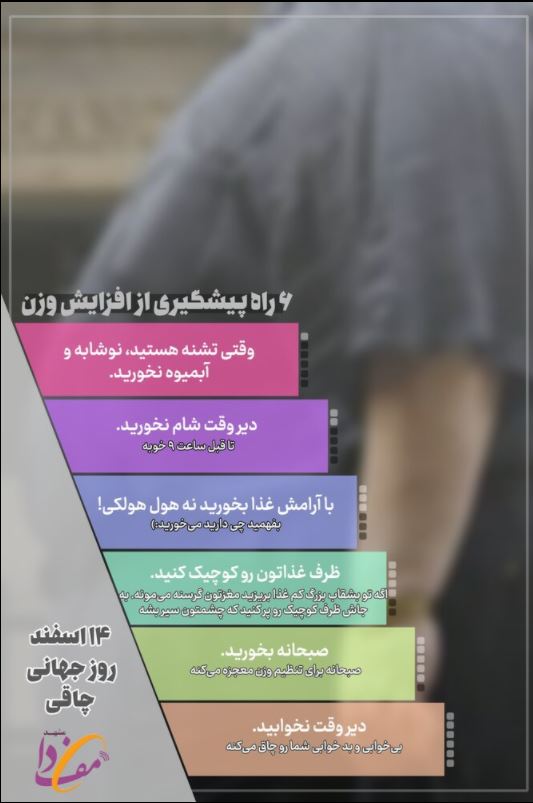 سرویس چند رسانه ای مفدا مشهد به مناسبت فرا رسیدن ۱۴ اسفند روز جهانی چاقی اینفوگرافی با موضوع ۶ راه پیشگیری از افزایش وزن منتشر کرد.