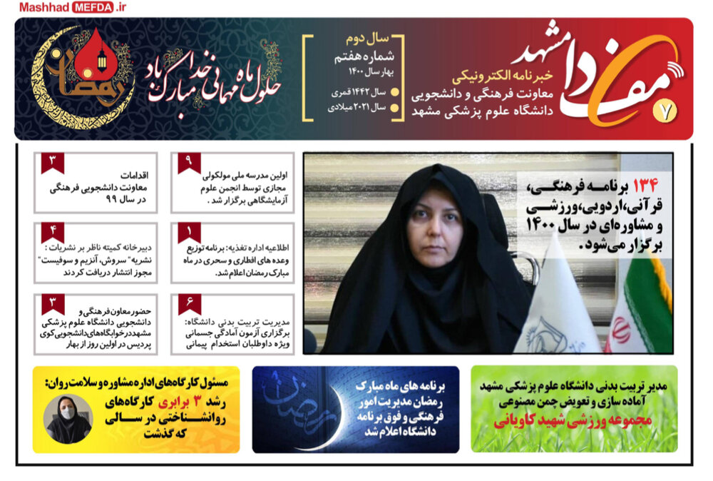 هفتمین خبرنامه مفدا مشهد منتشر شد، در این شماره مهمترین اخبار فعالیتها و رویدادهای مهم فرهنگی، صنفی، دانشجویی، آموزشی و علمی معاونت دانشجویی فرهنگی دانشگاه علوم پزشکی مشهد در فروردین ماه ۱۴۰۰ منتشر شده است.