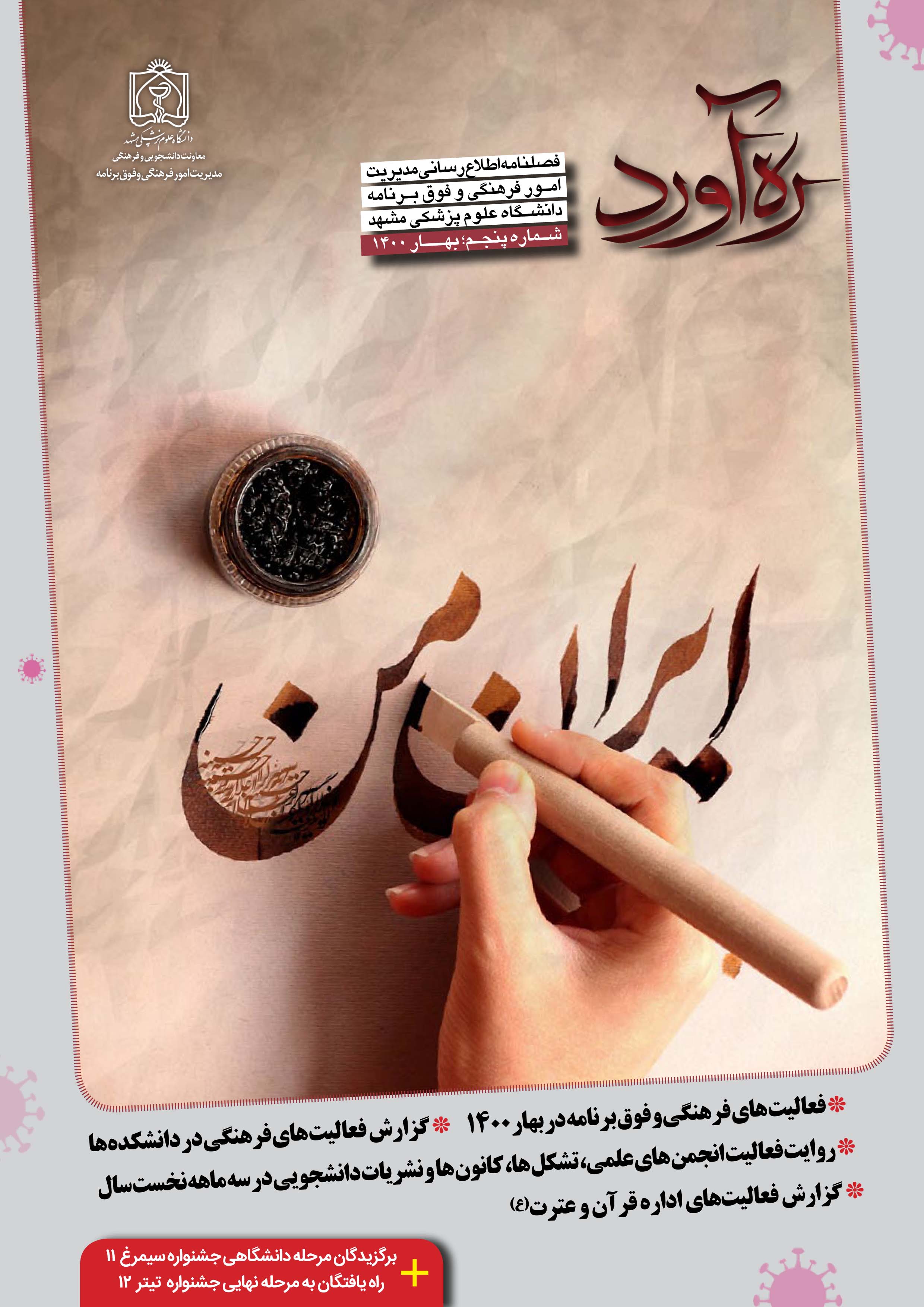 در این نشریه میخوانید: فعالیت های فرهنگی و فوق برنامه در بهار ۱۴۰۰ گزارش فعالیت های فرهنگی در دانشکده ها روایت فعالیت انجمن های علمی،تشکل ها،کانون ها و نشریات دانشجویی در سه ماهه نخست سال گزارش فعالیت های قرآن و عترت (ع) اعلام اسامی برگزیدگان مرحله دانشگاهی جشنواره سیمرغ۱۱ اعلام اسامی راه یافتگان به مرحله نهایی جشنواره تیتر ۱۱