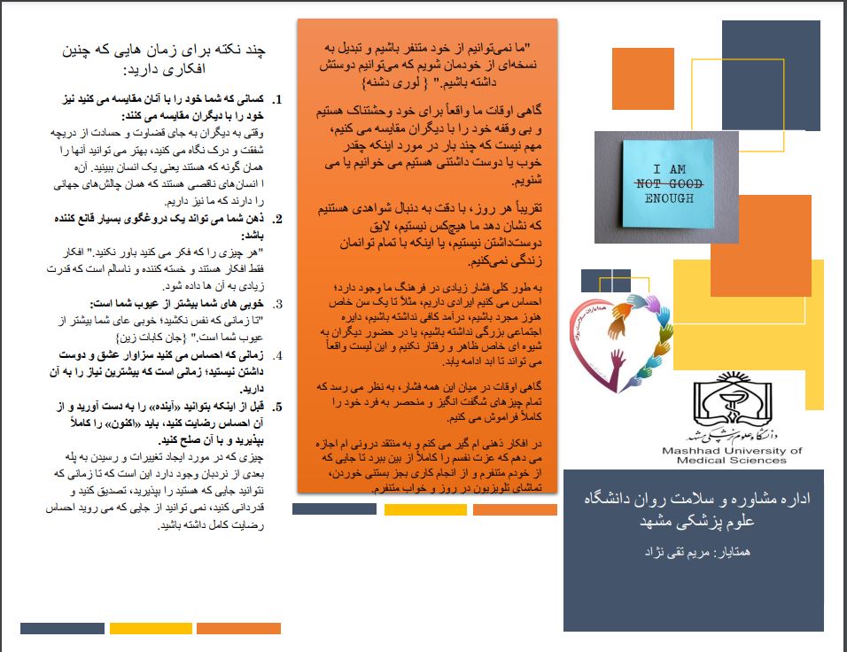 جعفریان مریم اخبار معاونت فرهنگی دانشجویی 15 مرداد 1401 15 مرداد 1401 بازدید: 130 امتیاز: ( 0 Rating ) پمفلت من کافی هستم امتیاز کاربران لطفا رای دهید رای 1 رای 2 رای 3 رای 4 رای 5 دکتر حمیده صمدی مسئول همتایاران اداره مشاوره و سلامت روان از طراحی و تهیه پمفلت های آموزشی توسط همتایاران ویژه تابستان اطلاع داد. در این خبر پمفلت با عنوان من کافی هستم که توسط همتایارمریم تقی نژاد تهیه و تنظیم شده است. براي مشاهده کليک کنيد قبلی بعدی
