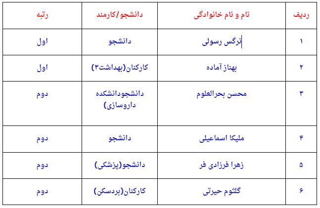 شایان ذکر است به نفرات برگزیده جهت اهدا جوایز از حوزه اداره فرهنگی کارکنان و دانشجویان دانشگاه در روز های آتی تماس گرفته میشود.