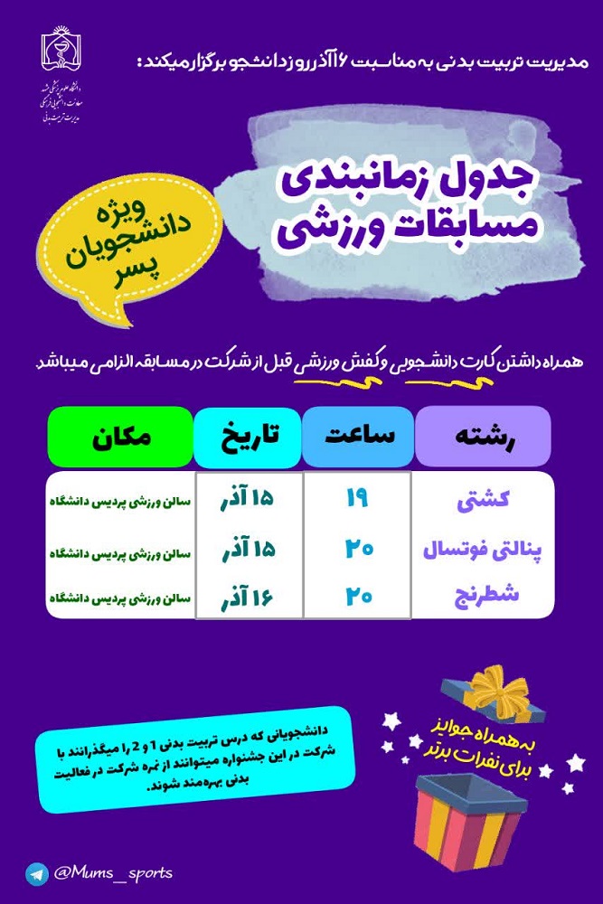 به گزارش مفدا ، مسابقات ورزشی ویژه دانشجویان پسر در رشته های کشتی ،پنالتی فوتسال و شطرنج از تاریخ ۱۵ الی ۱۶ آذر به مناسبت روز دانشجو برگزار می شود .دانشجویانی که درس تربیت بدنی ۱ و ۲ را می گذرانند با شرکت در این جشنواره می توانند از نمره شرکت در فعالیت بدنی بهرمند شوند .