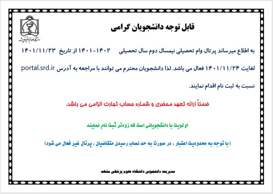 قابل توجه دانشجویان گرامی به اطلاع می رساند پرتال وام تحصیلی نیم سال ۱۴۰۲-۱۴۰۱ از تاریخ ۲۳ بهمن ماه لغایت ۲۴ بهمن ماه فعال می باشد.لذا دانشجویان محترم می توانند با مراجعه به آدرس portal.srd.ir نسبت به ثبت نام اقدام نمایند.