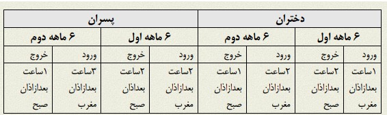 زمان ورود و خروج مجاز در خوابگاه ها و بسته شدن درب ورودی خوابگاه در ۶ ماهه اول و دوم سال به شرح ذیل میباشد . البته بر حسب شرایط اقلیمی ، فرهنگی ، اجتماعی و موقعیت خوابگاه ها ، کمیته اسکان می تواند زمان تعیین شده را کاهش یا افزایش دهد .
