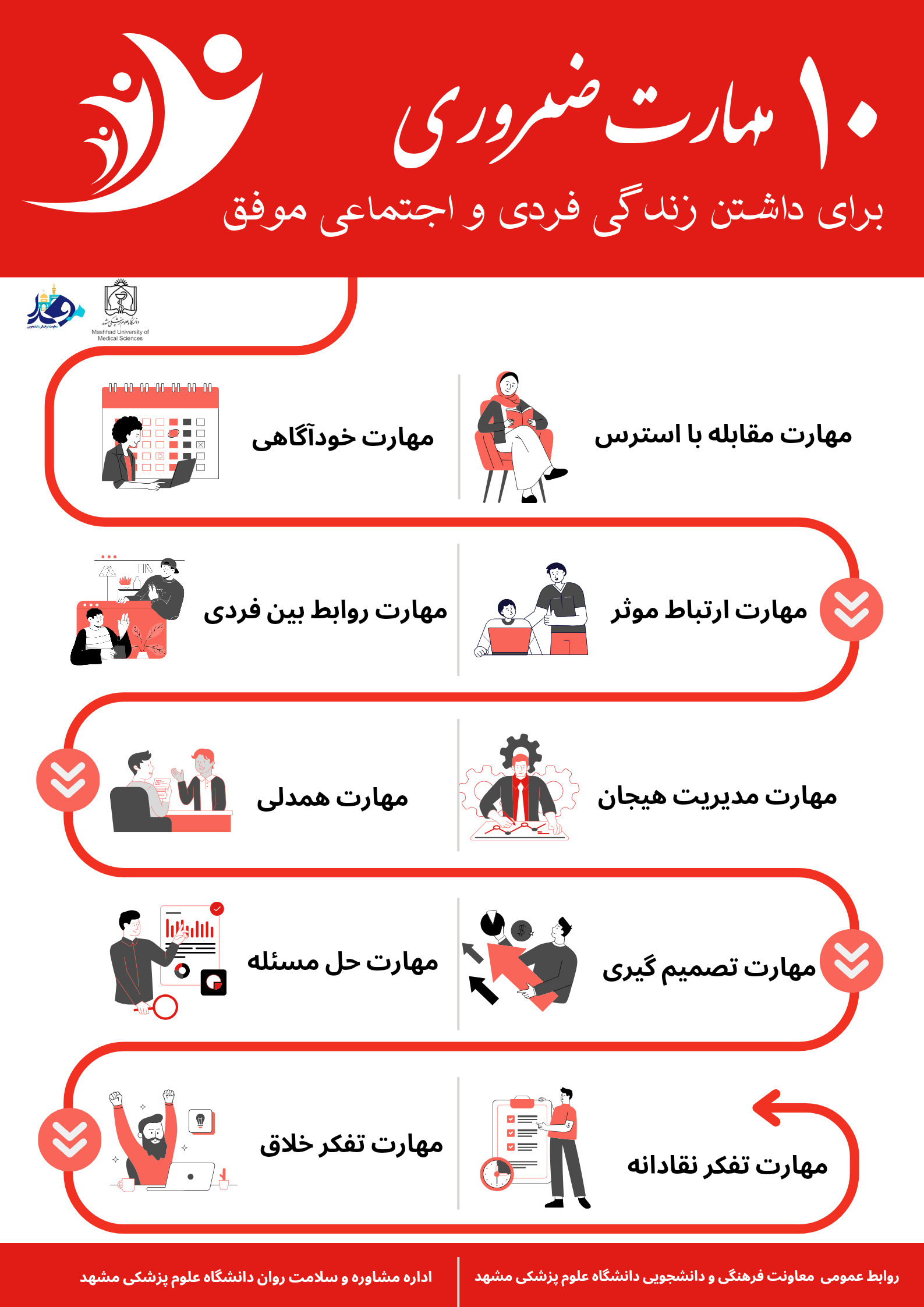 به همت اداره مشاوره و سلامت روان ۱۰ مهارت ضروری برای داشتن زندگی فردی و اجتماعی موفق در قالب اینفوگرافی بیان شده است.