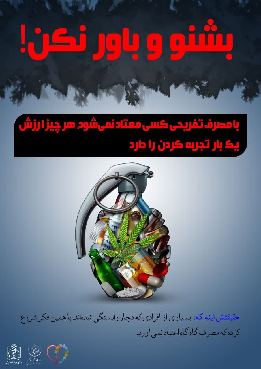 پوستر با عنوان "بشنو و باورنکن " در خصوص باورهای غلط در مصرف مواد، کاری از اداره سبک زندگی مرکز مشاوره دانشگاه علوم پزشکی مشهد