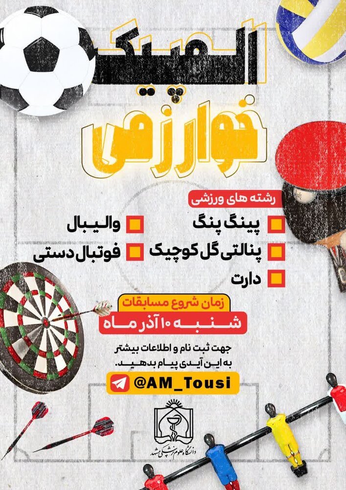 به گزارش مفدا ، مسابقات ورزشی با عنوان "المپیک خوارزمی" با همکاری مدیریت تربیت بدنی دانشگاه و به همت دانشجویان ورزشی، کار خود را با مسابقات دارت در روز شنبه، مورخ ۱۰ آذر ماه در دو بخش خانمها و آقایان (دانشجویان، کارکنان و اعضای هیات علمی) آغاز کرد. این رویداد با حضور بیش از ۱۵۰ نفر برگزار شد.