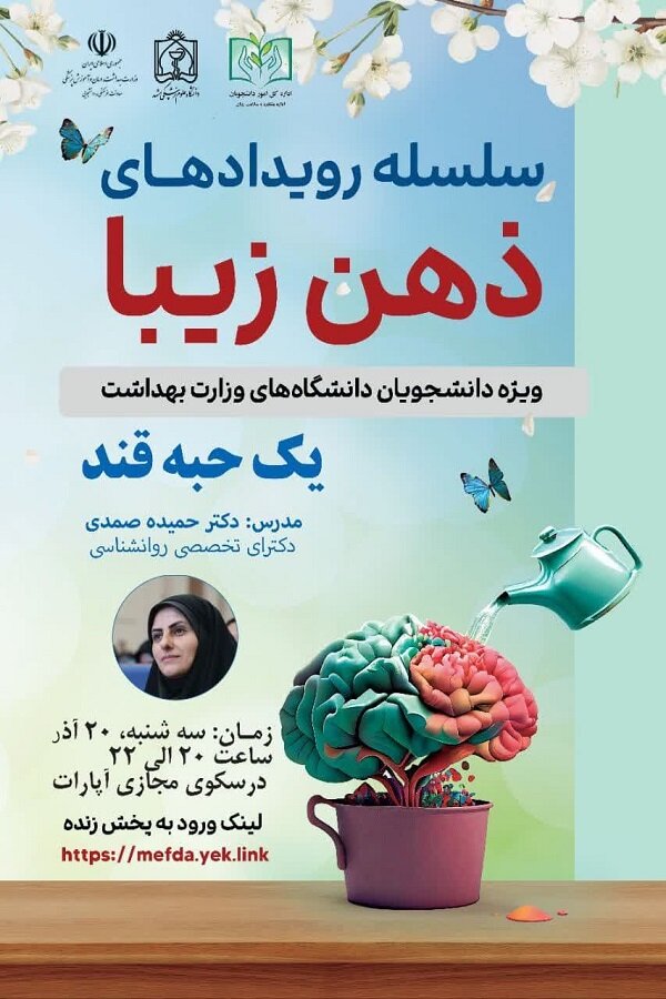 خاطرنشان می شود؛ سلسله رویدادهای ذهن زیبا مقرر است تا پایان سال جاری، سه شنبههای هر هفته با حضور اساتید صاحب نظر، با تجربه وتوانمند در ارائه مطالب جذاب در موضوعات سلامت روان برگزار شود و دانشجویان همه دانشگاهها و دانشکده های علوم پزشکی می توانند با ورود به لینکی که برای آنها هر هفته پیامک می شود، در بسترآپارات، در زمانهای تعیین شده با کارگاه و رویداد« ذهن زیبا» ارتباط برقرار کرده و زیر نظر اساتید باتجربه، در کلاسها شرکت کنند.