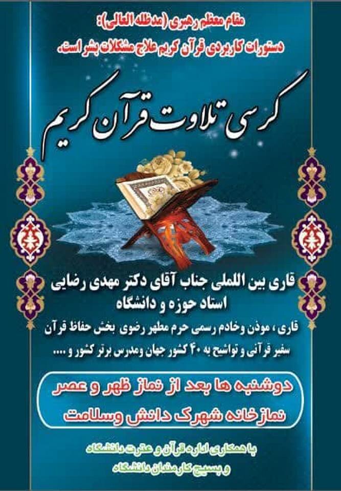 به منظور ترویج فرهنگ انس با قرآن کریم و تعمق در آیات وحی، جلسات کرسی تلاوت و تدبر در قرآن کریم هر دوشنبه بعد از نماز ظهر و عصر در نمازخانه شهرک دانش و سلامت برگزار می گردد.