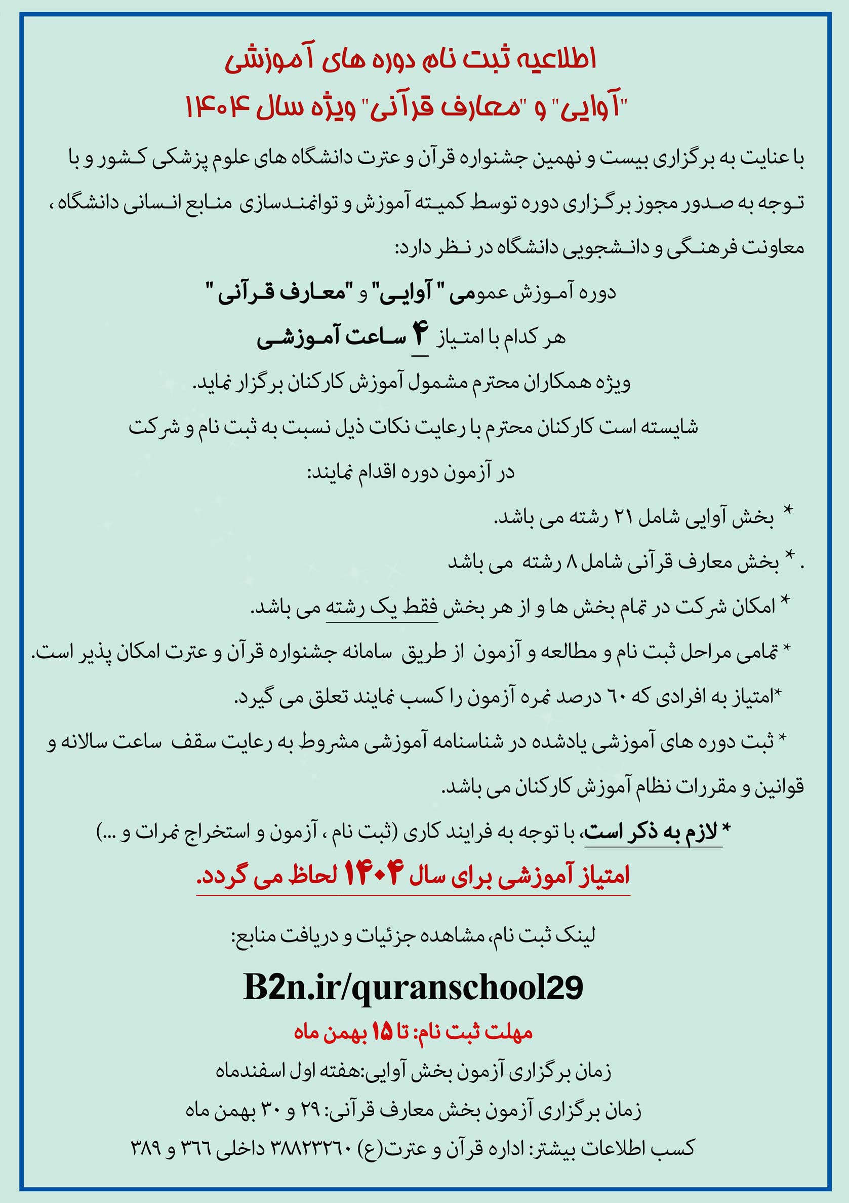 دوره آموزش عمومی رشته های " آوایی" و "معارف قرآنی " جشنواره قرآن هر کدام با امتیاز ۴ ساعت آموزشی کارکنان و در مجموع ۸ ساعت آموزش کارکنان تصویب گردید.