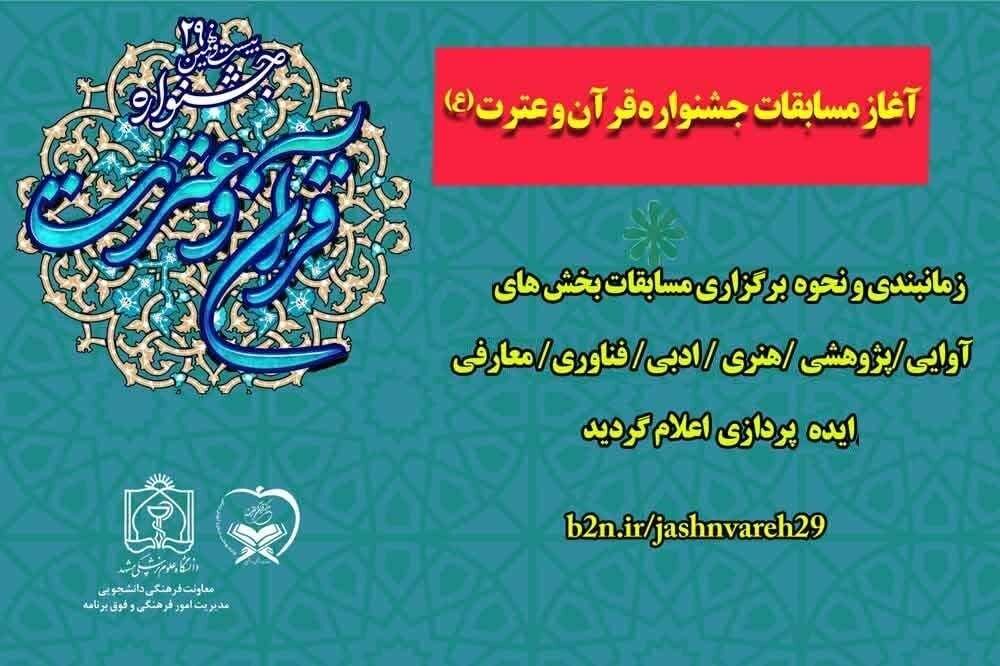 در بخش های پژوهشی، هنری، فناوری، ایده پردازی و ادبی نیز فایل های متنی و تصویری باید تا هفتم اسفندماه به شماره ۰۹۹۲۸۷۸۴۱۷۸ در پیام رسان ایتا - دبیرخانه جشنواره قرآن و عترت(ع)- ارسال گردد.