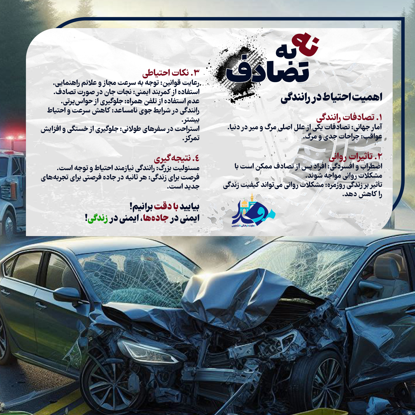 ینفوگرافیک "نه به تصادف" تحت عنوان "اهمیت احتیاط در رانندگی" کاری از روابط عمومی معاونت فرهنگی دانشجویی دانشگاه علوم پزشکی مشهد / طراح: علی اکبر حبیبی دانشجوی فوریت های پزشکی دانشگاه علوم پزشکی مشهد